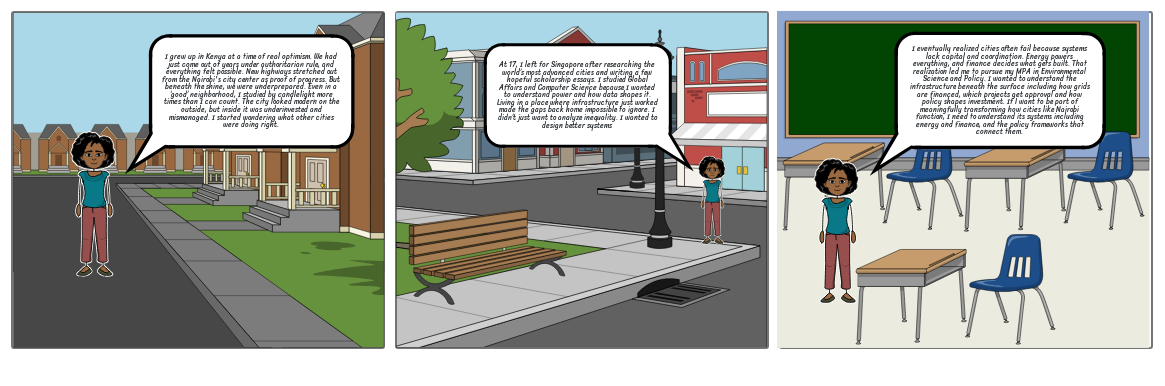 I eventually realized cities often fail because systems lack capital and coordination. Energy powers everything, and finance decides what gets built. That realization led me to pursue my MPA in Environmental Science and Policy. I wanted to understand the infrastructure beneath the surface including how grids are financed, which projects get approval and how policy shapes investment. If I want to be part of meaningfully transforming how cities like Nairobi function, I need to understand its systems including energy and finance, and the policy frameworks that connect them.