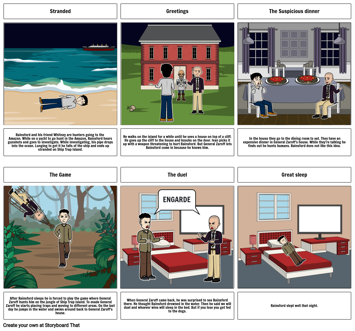 Rainsford and his friend Whitney are hunters going to the Amazon. While on a yacht to go hunt in the Amazon, Rainsford hears gunshots and goes to investigate. While investigating, his pipe drops into the ocean. Lunging to get it he falls of the ship and ends up stranded on Ship Trap Island.