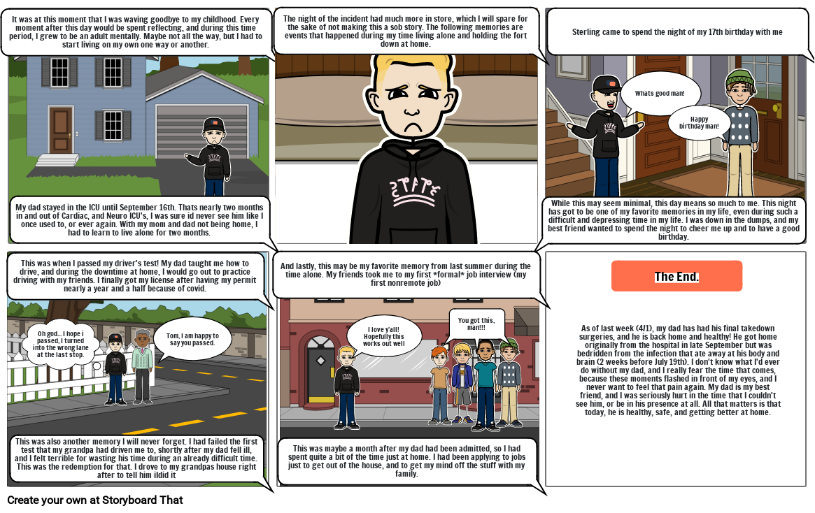 My dad stayed in the ICU until September 16th. Thats nearly two months in and out of Cardiac, and Neuro ICU's, I was sure id never see him like I once used to, or ever again. With my mom and dad not being home, I had to learn to live alone for two months.