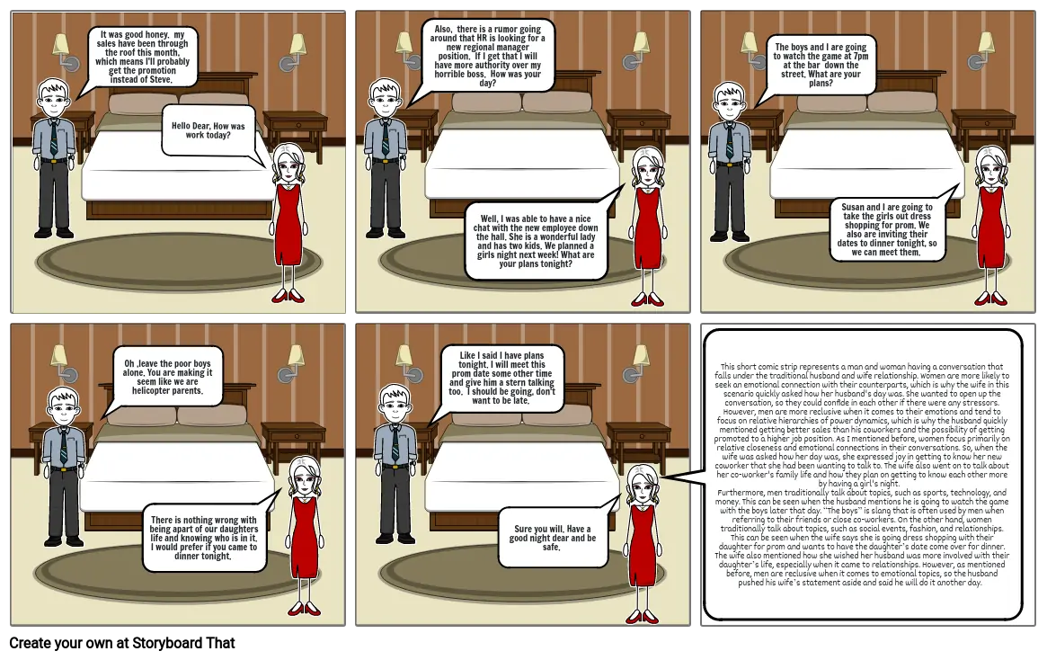This short comic strip represents a man and woman having a conversation that falls under the traditional husband and wife relationship. Women are more likely to seek an emotional connection with their counterparts, which is why the wife in this scenario quickly asked how her husband's day was. She wanted to open up the conversation, so they could confide in each other if there were any stressors. However, men are more reclusive when it comes to their emotions and tend to focus on relative hierarchies of power dynamics, which is why the husband quickly mentioned getting better sales than his coworkers and the possibility of getting promoted to a higher job position. As I mentioned before, women focus primarily on relative closeness and emotional connections in their conversations. So, when the wife was asked how her day was, she expressed joy in getting to know her new coworker that she had been wanting to talk to. The wife also went on to talk about her co-worker's family life and how they plan on getting to know each other more by having a girl's night. Furthermore, men traditionally talk about topics, such as sports, technology, and money. This can be seen when the husband mentions he is going to watch the game with the boys later that day. “The boys” is slang that is often used by men when referring to their friends or close co-workers. On the other hand, women traditionally talk about topics, such as social events, fashion, and relationships. This can be seen when the wife says she is going dress shopping with their daughter for prom and wants to have the daughter’s date come over for dinner. The wife also mentioned how she wished her husband was more involved with their daughter’s life, especially when it came to relationships. However, as mentioned before, men are reclusive when it comes to emotional topics, so the husband pushed his wife’s statement aside and said he will do it another day.