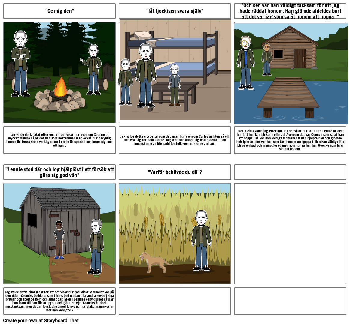 Detta citat valde jag eftersom att det visar hur lättlurad Lennie är och hur lätt han kan bli kontrollerad. Även om det var George som sa åt han att hoppa i så var han väldigt tacksam att han hjälpte han och glömde helt bort att det var han som fått honom att hoppa i. Han kan väldigt lätt bli påverkad och manipulerad men som tur så har han George som bryr sig om honom.