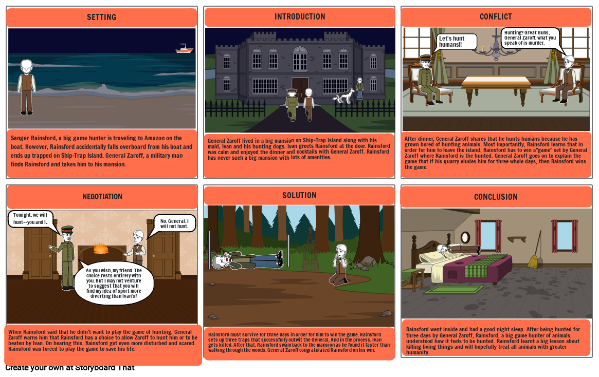 Sanger Rainsford, a big game hunter is traveling to Amazon on the boat. However, Rainsford accidentally falls overboard from his boat and ends up trapped on Ship-Trap Island. General Zaroff, a military man finds Rainsford and takes him to his mansion.