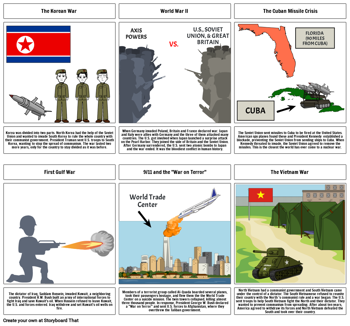When Germany invaded Poland, Britain and France declared war. Japan and Italy were allies with Germany and the three of them attacked many countries. The U.S. got involved when Japan launched a surprise attack on the Pearl Harbor. They joined the side of Britain and the Soviet Union. After Germany surrendered, the U.S. sent two atomic bombs to Japan and the war ended. It was the bloodiest conflict in human history.