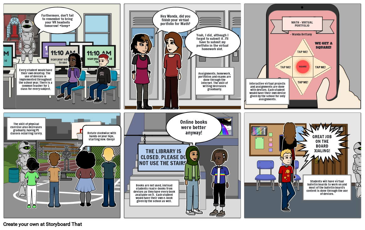 Interactive virtual projects and assignments are done with devices. Each student would have their own device given by the school for only assignments.