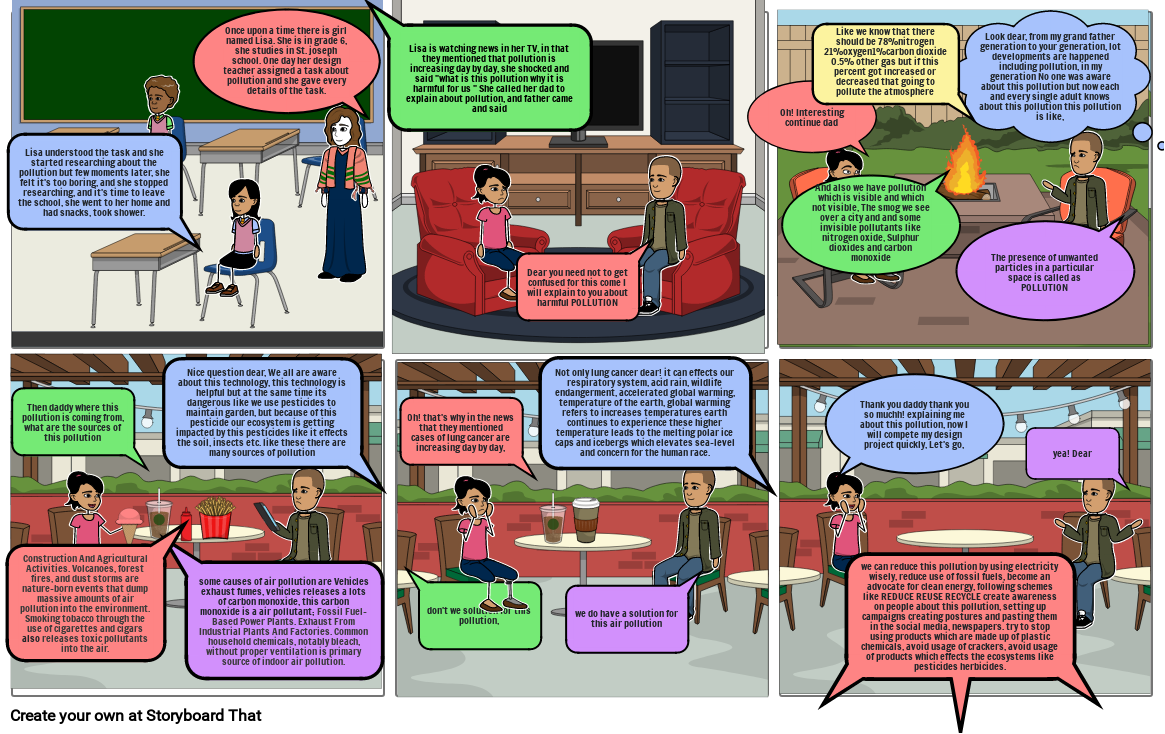 Once upon a time there is girl named Lisa. She is in grade 6, she studies in St. joseph school. One day her design teacher assigned a task about pollution and she gave every details of the task.