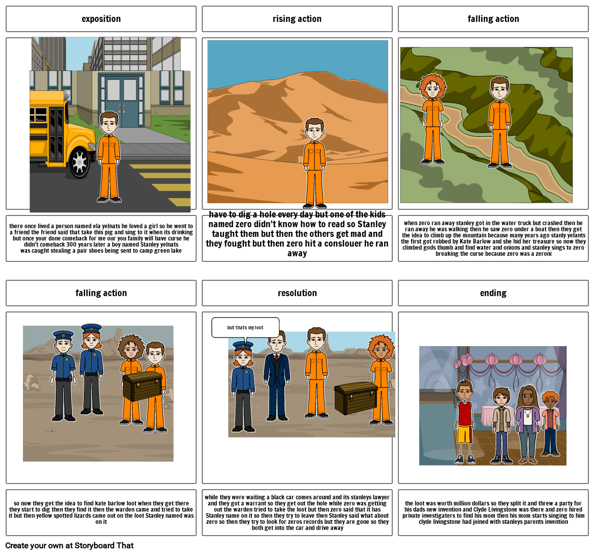 when Stanley Stanley first came Mr sir said you have to dig a hole every day but one of the kids named zero didn't know how to read so Stanley taught them but then the others get mad and they fought but then zero hit a conslouer he ran away