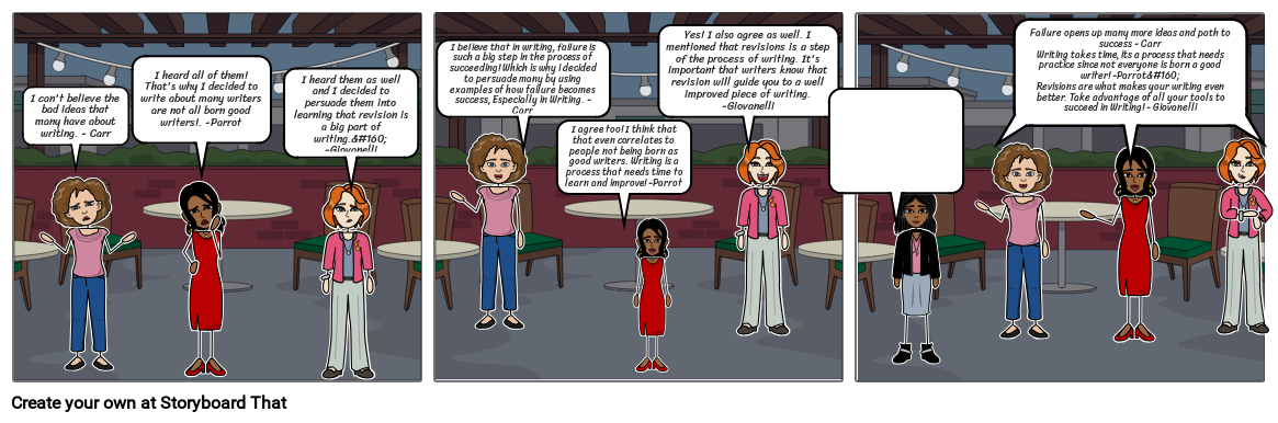 Failure opens up many more ideas and path to success - CarrWriting takes time, its a process that needs practice since not everyone is born a good writer! -Parrot Revisions are what makes your writing even better. Take advantage of all your tools to succeed in Writing! - Giovanelli