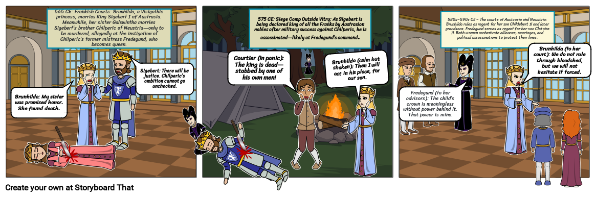 580s–590s CE – The courts of Austrasia and Neustria: Brunhilda rules as regent for her son Childebert II and later grandsons. Fredegund serves as regent for her son Clotaire II. Both women orchestrate alliances, marriages, and political assassinations to protect their lines.