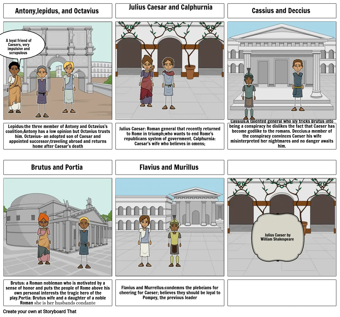 Lepidus:the three member of Antony and Octavius’s coalition;Antony has a low opinion but Octavius trusts him. Octavius- an adopted son of Caesar and appointed successor;traveling abroad and returns home after Caesar’s death