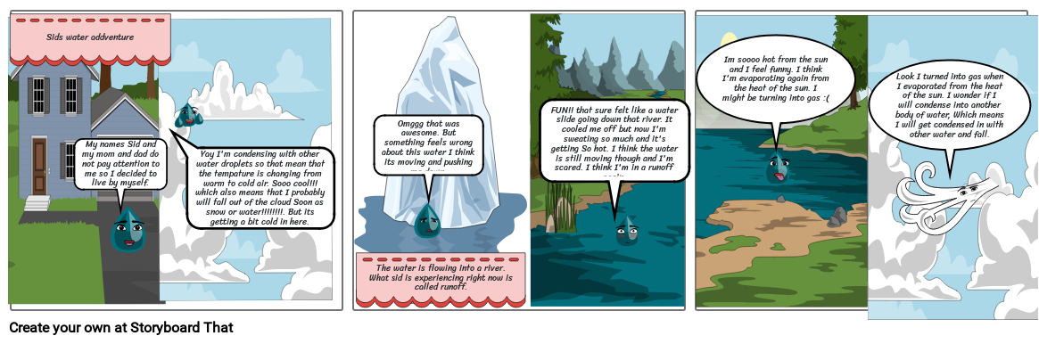 Look I turned into gas when I evaporated from the heat of the sun. I wonder if I will condense into another body of water, Which means I will get condensed in with other water and fall.