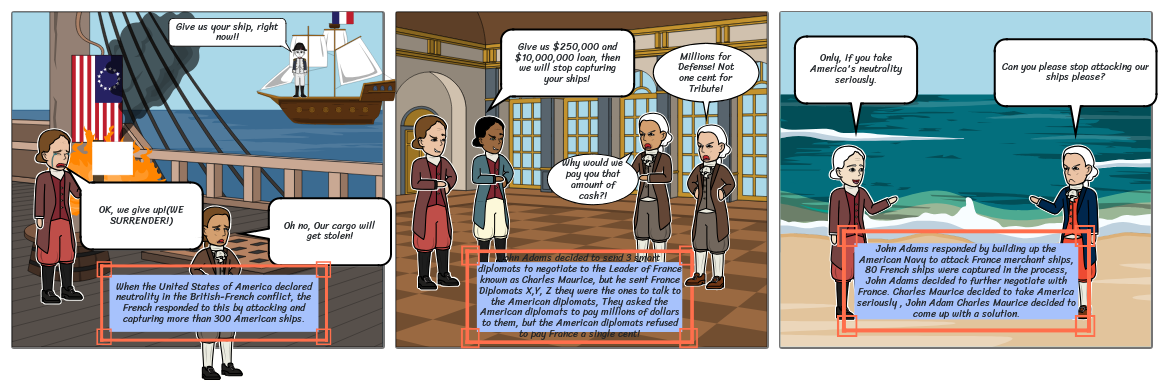 John Adams decided to send 3 smart diplomats to negotiate to the Leader of France known as Charles Maurice, but he sent France Diplomats X,Y, Z they were the ones to talk to the American diplomats, They asked the American diplomats to pay millions of dollars to them, but the American diplomats refused to pay France a single cent!