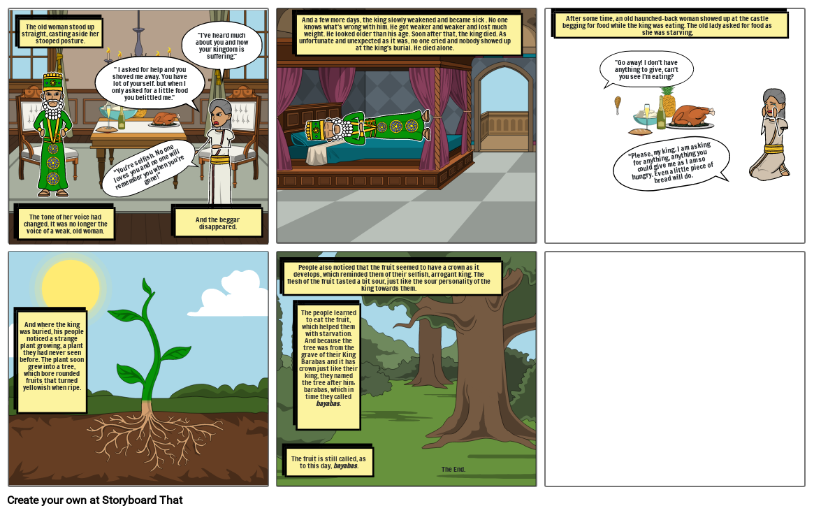 The people learned to eat the fruit, which helped them with starvation. And because the tree was from the grave of their King Barabas and it has crown just like their king, they named the tree after him: barabas, which in time they called bayabas.