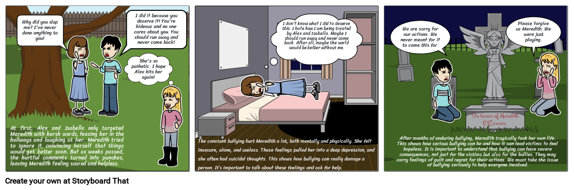 After months of enduring bullying, Meredith tragically took her own life. This shows how serious bullying can be and how it can lead victims to feel hopeless. It is important to understand that bullying can have severe consequences, not just for the victims but also for the bullies. They may carry feelings of guilt and regret for their actions. We must take the issue of bullying seriously to help everyone involved.