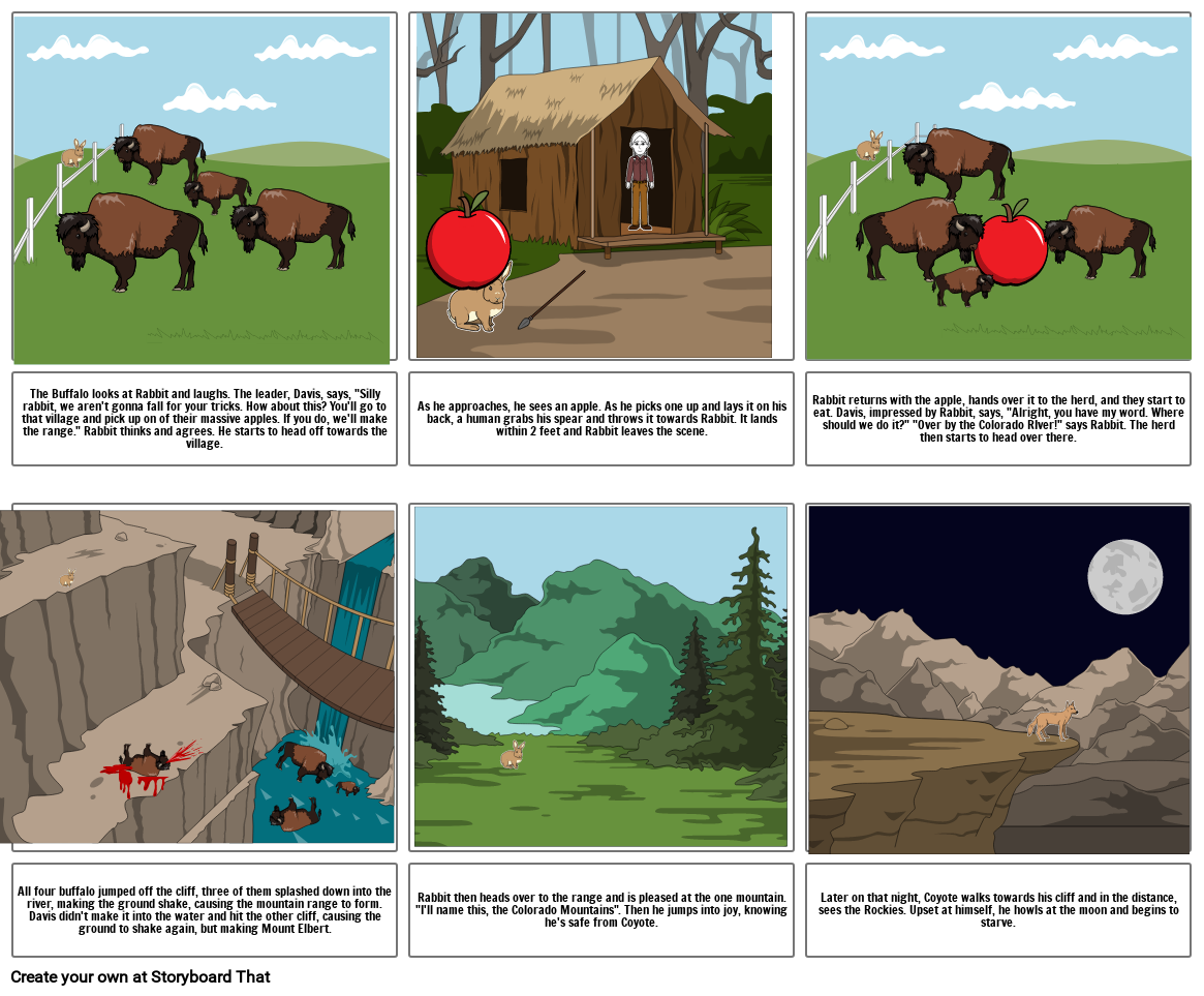 All four buffalo jumped off the cliff, three of them splashed down into the river, making the ground shake, causing the mountain range to form. Davis didn't make it into the water and hit the other cliff, causing the ground to shake again, but making Mount Elbert.