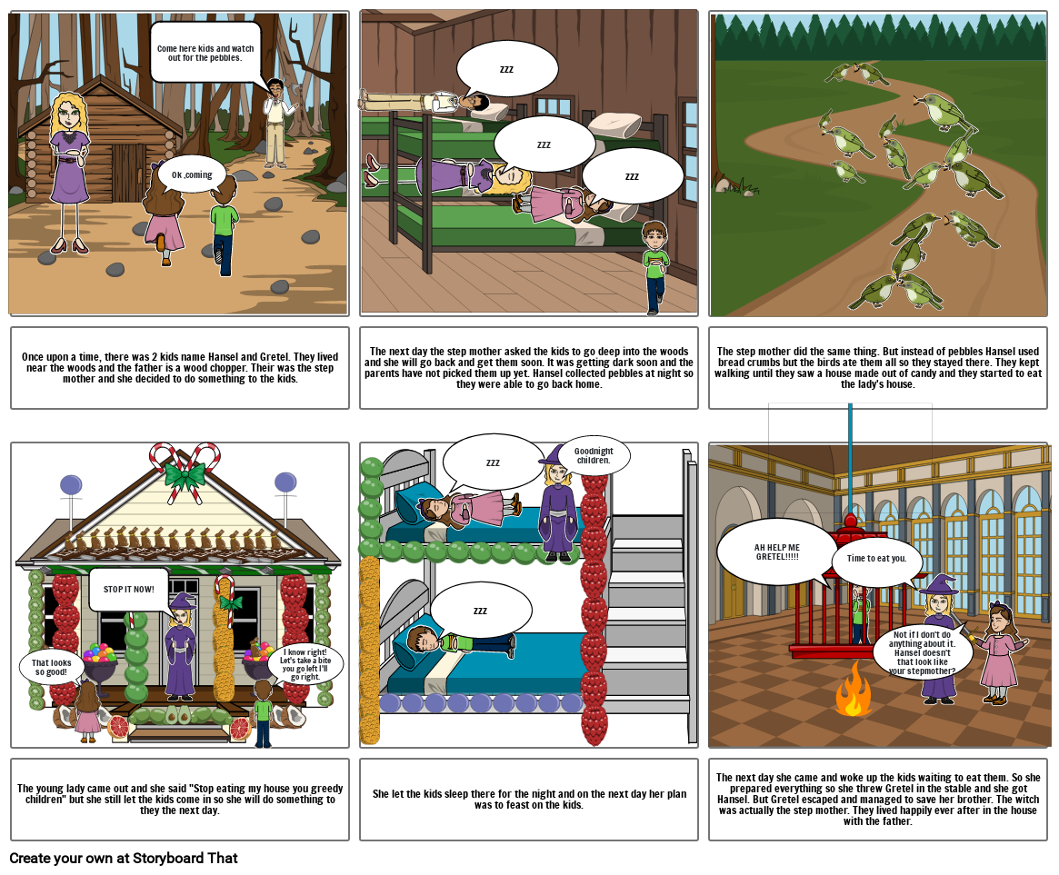 The next day she came and woke up the kids waiting to eat them. So she prepared everything so she threw Gretel in the stable and she got Hansel. But Gretel escaped and managed to save her brother. The witch was actually the step mother. They lived happily ever after in the house with the father.