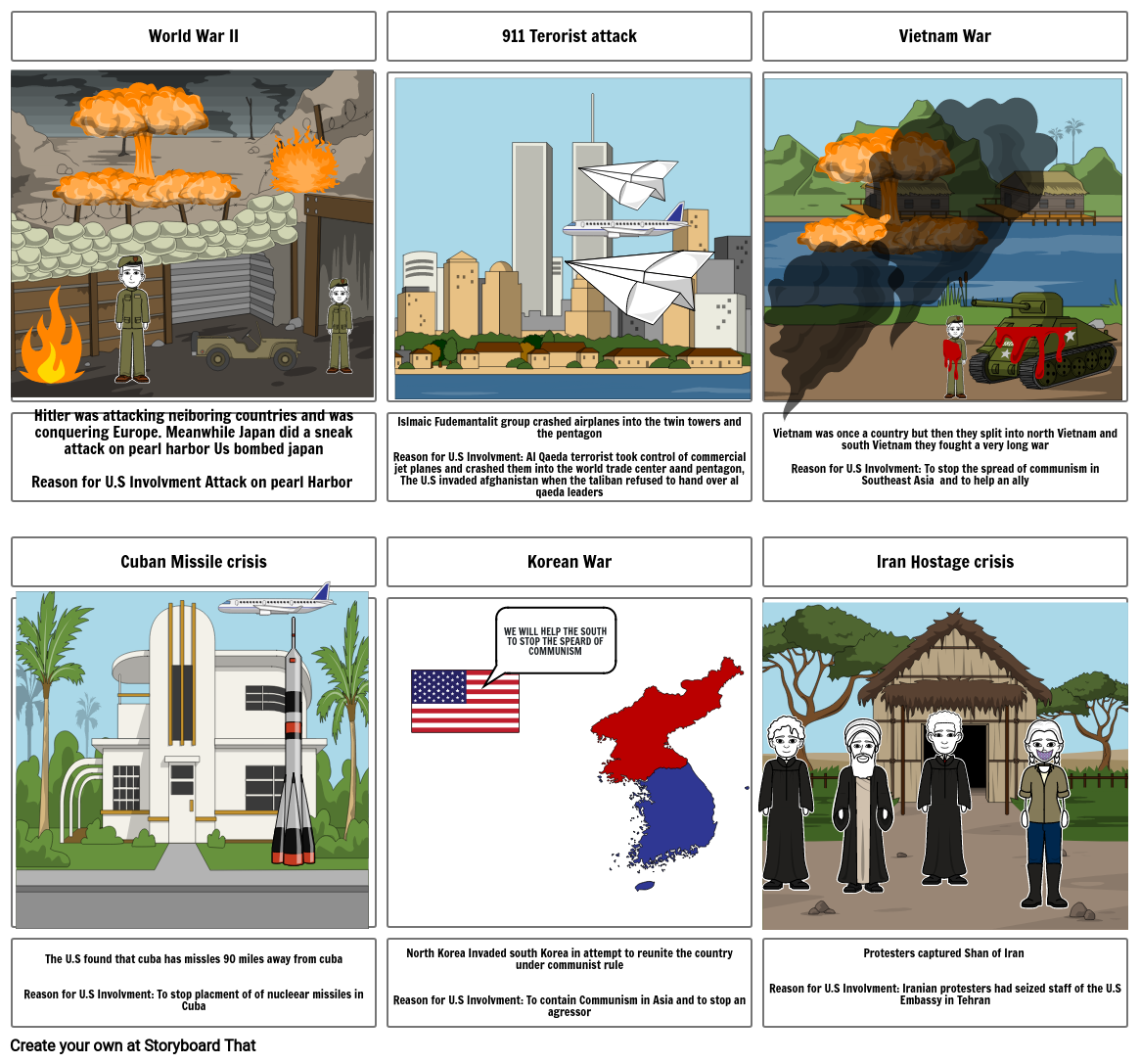 North Korea Invaded south Korea in attempt to reunite the country under communist ruleReason for U.S Involvment: To contain Communism in Asia and to stop an agressor