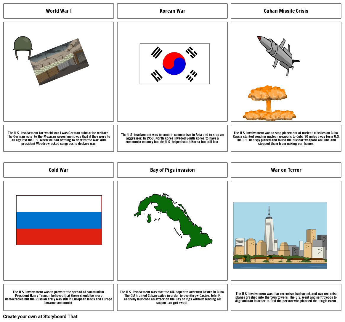 The U.S. involvement was to stop placement of nuclear missiles on Cuba.Russia started sending nuclear weapons to Cuba 90 miles away form U.S. The U.S. had spy planed and found the nuclear weapons on Cuba and stopped them from nuking our homes.