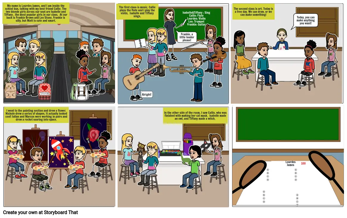 My name is Lourdes James, and I am inside the school bus, talking with my best friend Callie. The two blonde girls across our seat are Isabelle and Tiffany , the most popular girls in our class. At our back is Frankie Brown and Leo Stone. Frankie is silly, but Matt is cute and smart.