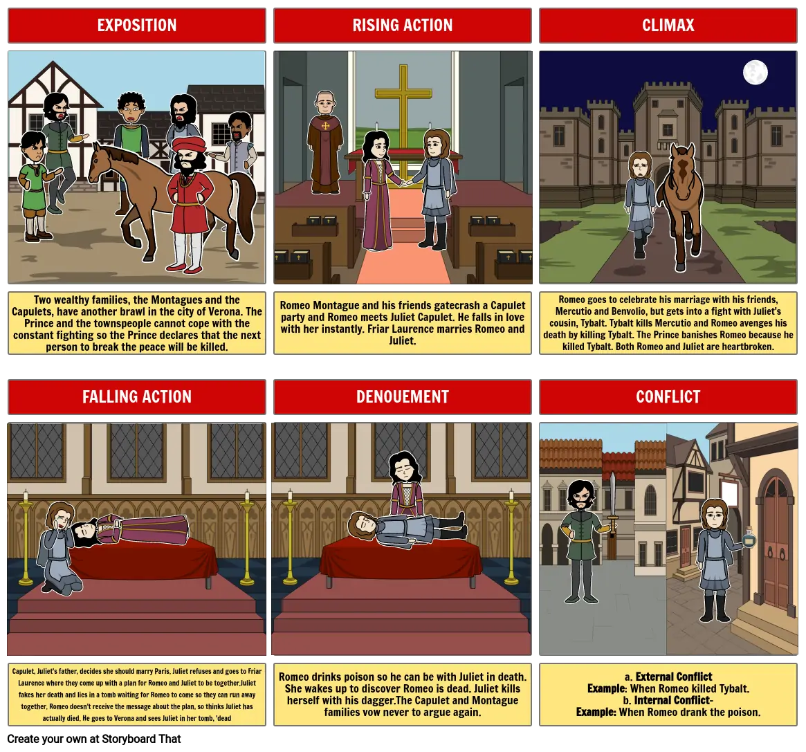 a. External ConflictExample: When Romeo killed Tybalt.b. Internal Conflict-Example: When Romeo drank the poison.