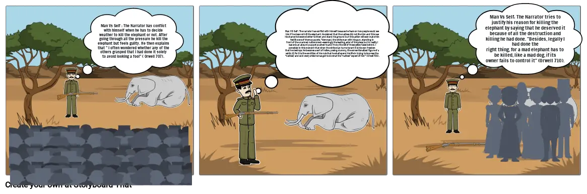 Man Vs Self : The Narrator has conflict with himself when he has to decide weather to kill the elephant or not. After going through all the pressure he kill the elephant but feels guilty. He then explains that " I often wondered whether any of the others grasped that I had done it solelyto avoid looking a fool" ( Orwell 707).