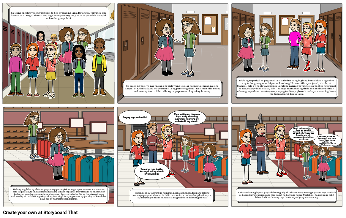 Biglang napatigil sa pagsasalita si Kristina nang biglang humalakhak ng sobra ang tatlong magkakaibigan sa kanilang likuran. Sila ay si Jonel, Nicole, at Marisol. Sila ay nagtatawanan sa kanilang narinig patungkol sa pagbili ng isusuot sa ukay-ukay dahil sila ay bibili sa mga mamahaling tindahan at pinandidirian nila ang mga damit sa ukay-ukay sapagkat ito ay ginamit na kaya maaaring ito ay madumi at hindi kaaya-aya.