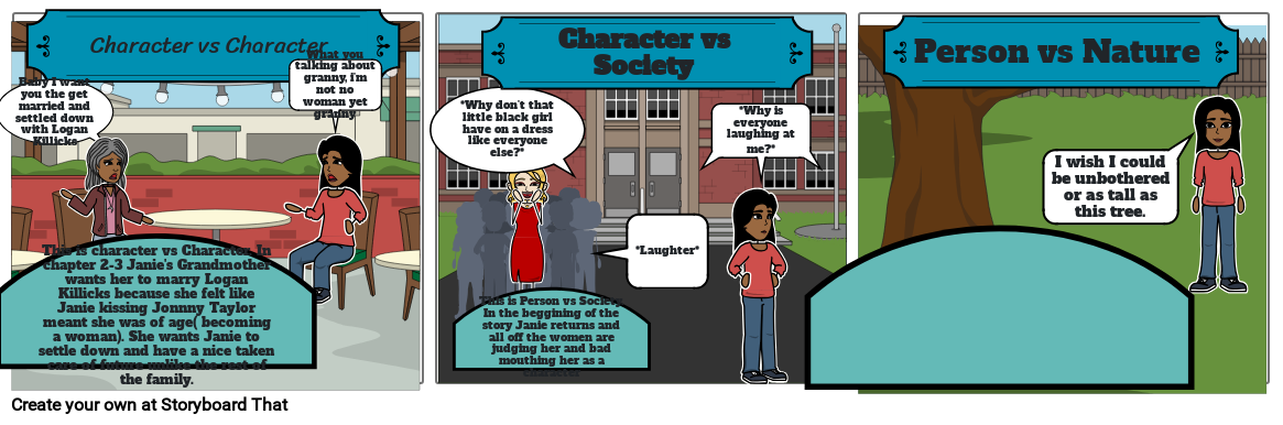 This is Person vs Society. In the beggining of the story Janie returns and all off the women are judging her and bad mouthing her as a character