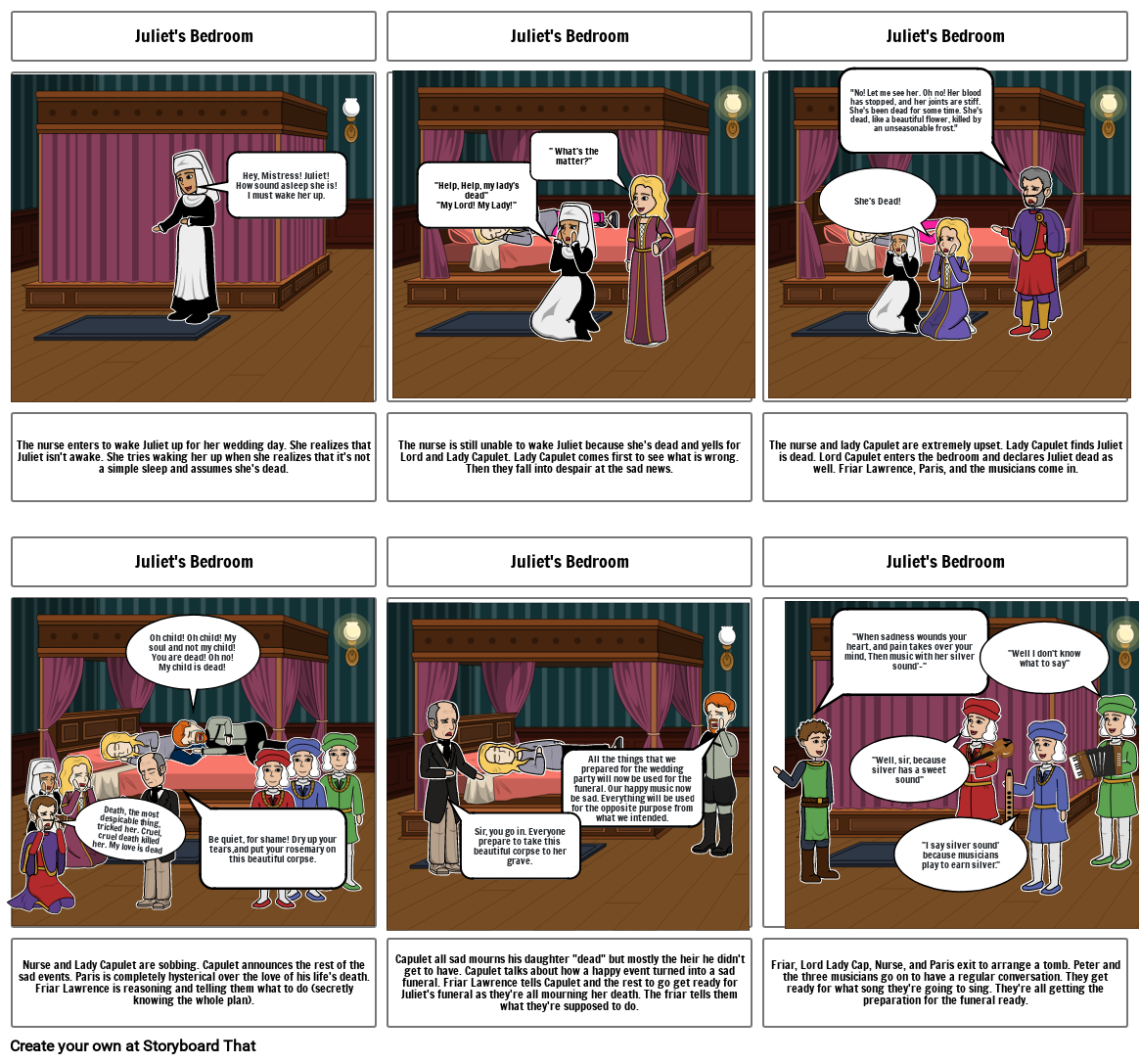 The nurse enters to wake Juliet up for her wedding day. She realizes that Juliet isn't awake. She tries waking her up when she realizes that it's not a simple sleep and assumes she's dead.