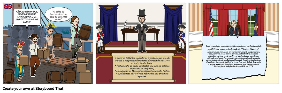 Como resposta às opressões sofridas, os colonos, que haviam criado em 1765 uma organização chamada: Os “Filhos da Liberdade”, ampliaram sua militância. Este era um grupo pró-independência, que promovia ações contra a Coroa, defendendo a liberdade individual e o livre comércio. Novos confrontos se sucederam deixando a situação fora de controle, sendo apaziguada somente com a Independência dos Estados Unidos da América, libertando as 13 colônias do domínio inglês. Por isso a Festa do Chá de Boston foi a origem popular da Revolução Americana, que culminou com a declaração de Independência dos EUA, em 1776.