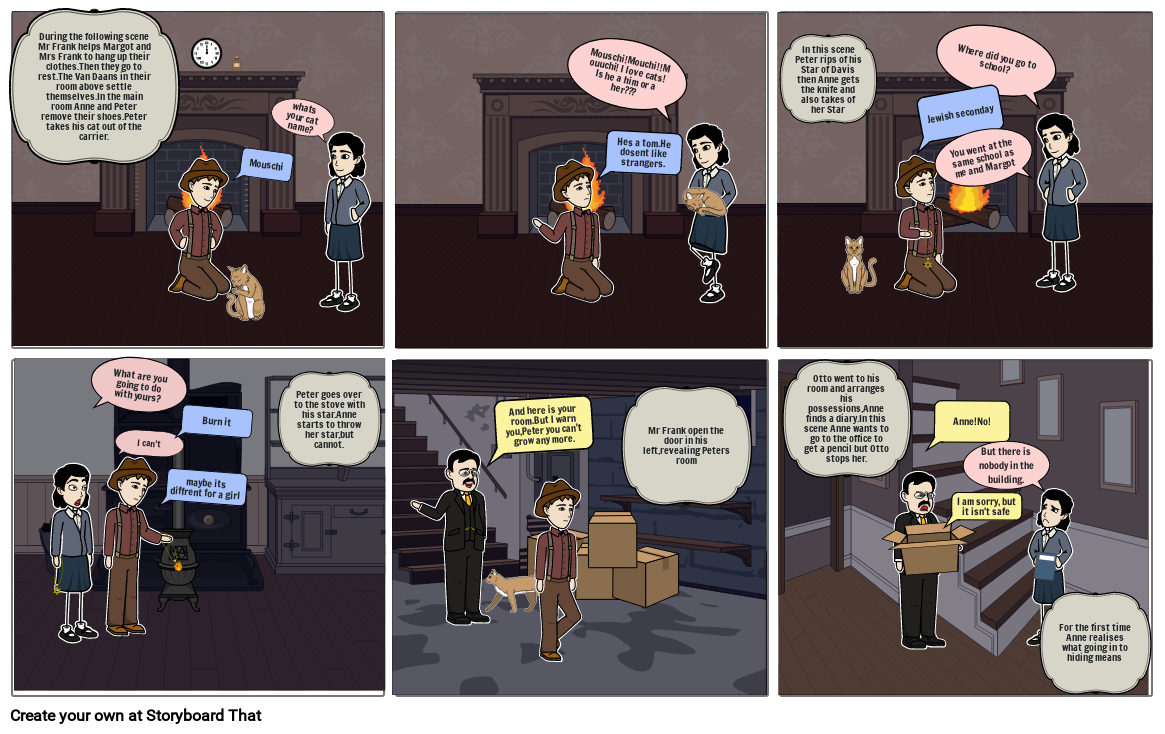 During the following scene Mr Frank helps Margot and Mrs Frank to hang up their clothes.Then they go to rest.The Van Daans in their room above settle themselves.In the main room Anne and Peter remove their shoes.Peter takes his cat out of the carrier.