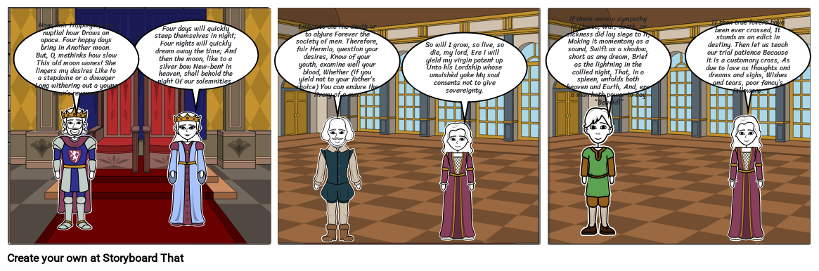 Now, fair Hippolyta, our nuptial hour Draws on apace. Four happy days bring in Another moon. But, O, methinks how slow This old moon wanes! She lingers my desires Like to a stepdame or a dowager Long withering out a young man’s revenue.