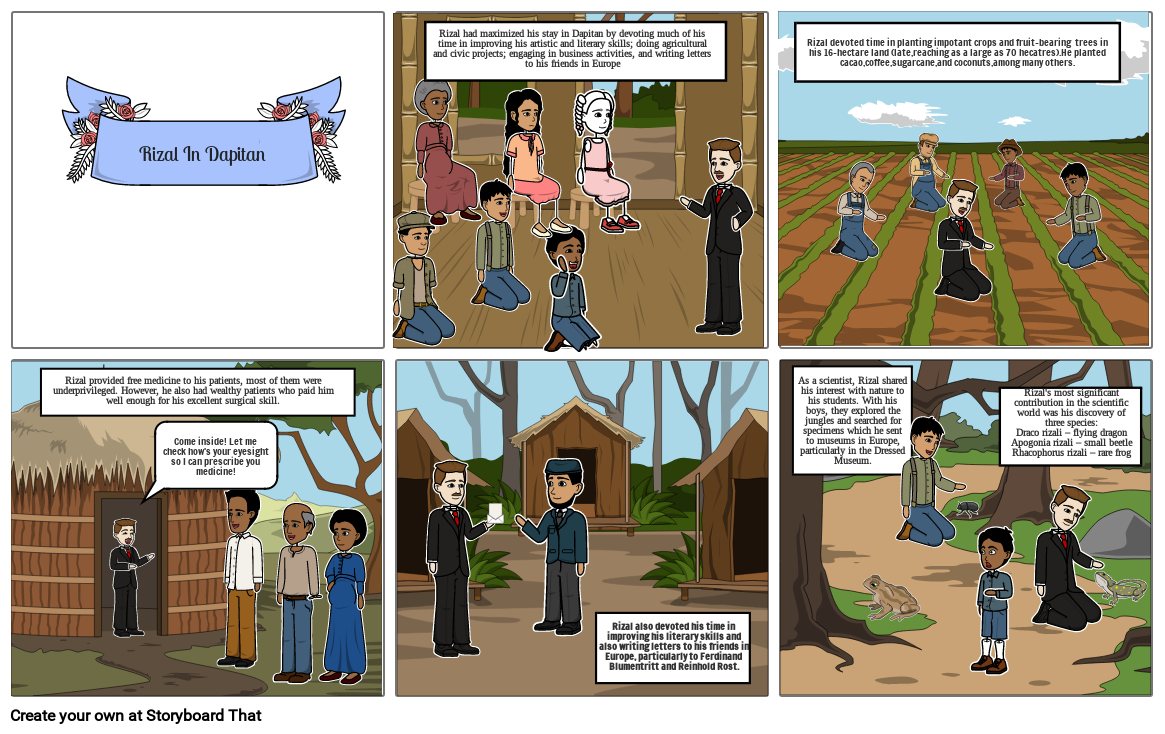 Rizal had maximized his stay in Dapitan by devoting much of his time in improving his artistic and literary skills; doing agricultural and civic projects; engaging in business activities, and writing letters to his friends in Europe