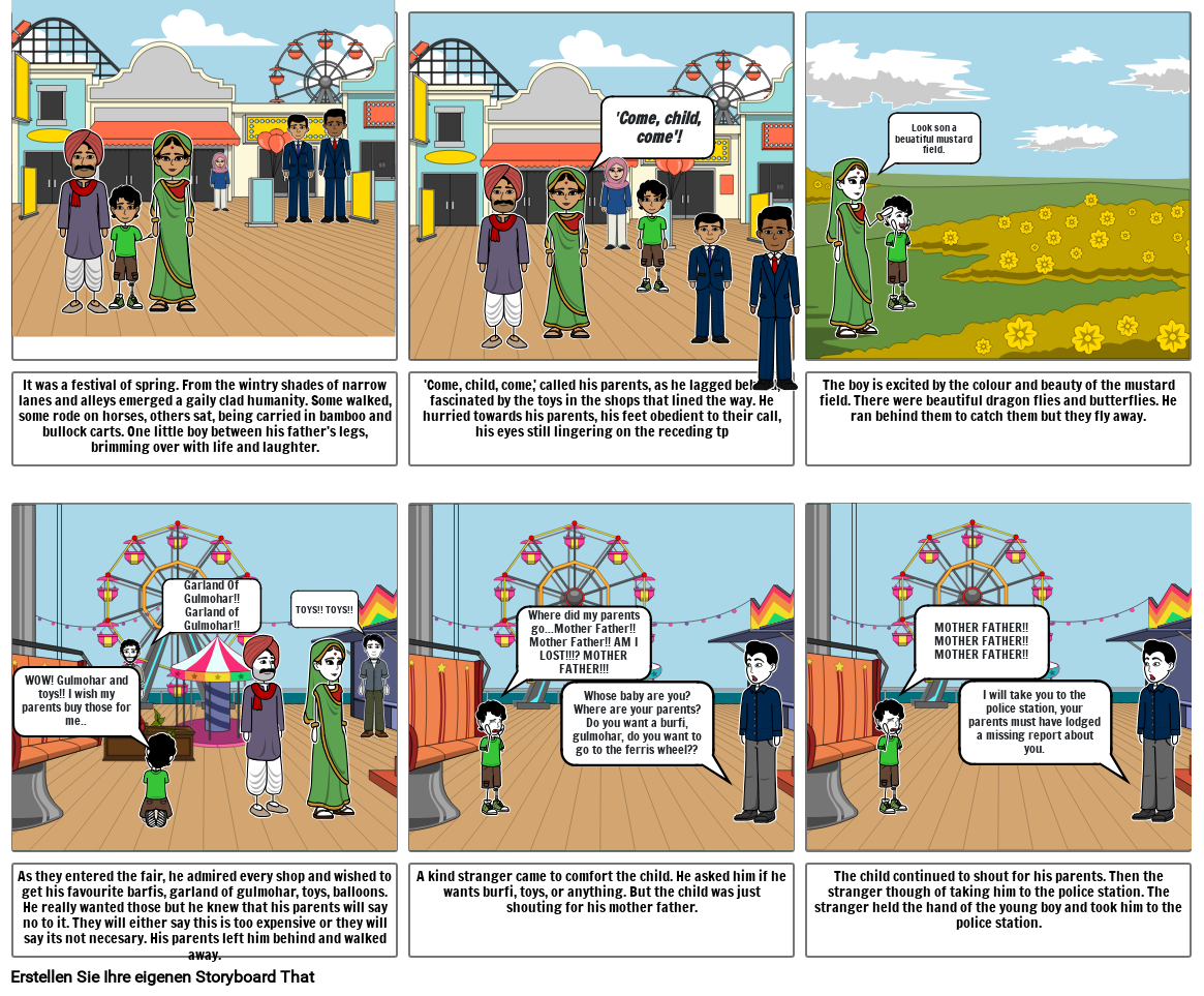 As they entered the fair, he admired every shop and wished to get his favourite barfis, garland of gulmohar, toys, balloons. He really wanted those but he knew that his parents will say no to it. They will either say this is too expensive or they will say its not necesary. His parents left him behind and walked away.