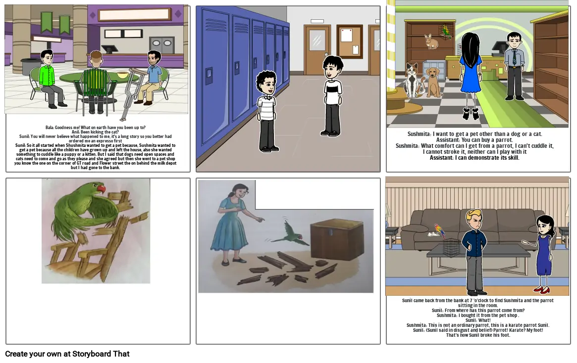 Sunil came back from the bank at 7 'o'clock to find Sushmita and the parrot sitting in the room.Sunil: From where has this parrot come from?Sushmita: I bought it from the pet shop .Sunil: What! Sushmita: This is not an ordinary parrot, this is a karate parrot Sunil.Sunil: (Sunil said in disgust and belief) Parrot! Karate? My foot!That's how Sunil broke his foot.