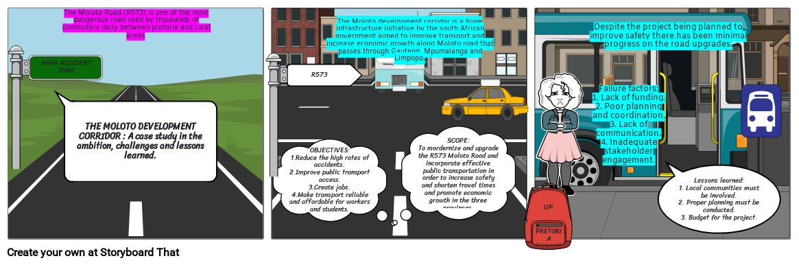 SCOPE:To mordernize and upgrade the R573 Moloto Road and incorporate effective public transportation in order to increase safety and shorten travel times and promote economic growth in the three provinces.