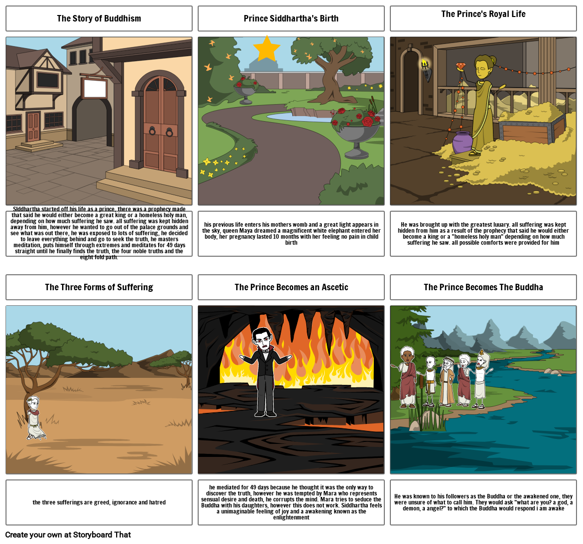 SIddhartha started off his life as a prince, there was a prophecy made that said he would either become a great king or a homeless holy man, depending on how much suffering he saw. all suffering was kept hidden away from him, however he wanted to go out of the palace grounds and see what was out there, he was exposed to lots of suffering, he decided to leave everything behind and go to seek the truth, he masters meditation, puts himself through extremes and meditates for 49 days straight until he finally finds the truth, the four noble truths and the eight fold path.