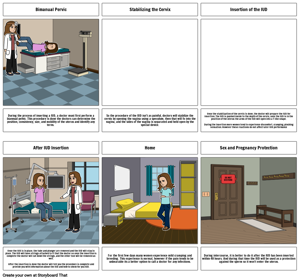 During the process of inserting a IUD, a doctor must first perform a biannual pelvic. This procedure is done the doctors can determine the position, consistency, size, and mobility of the uterus and identify any terns.