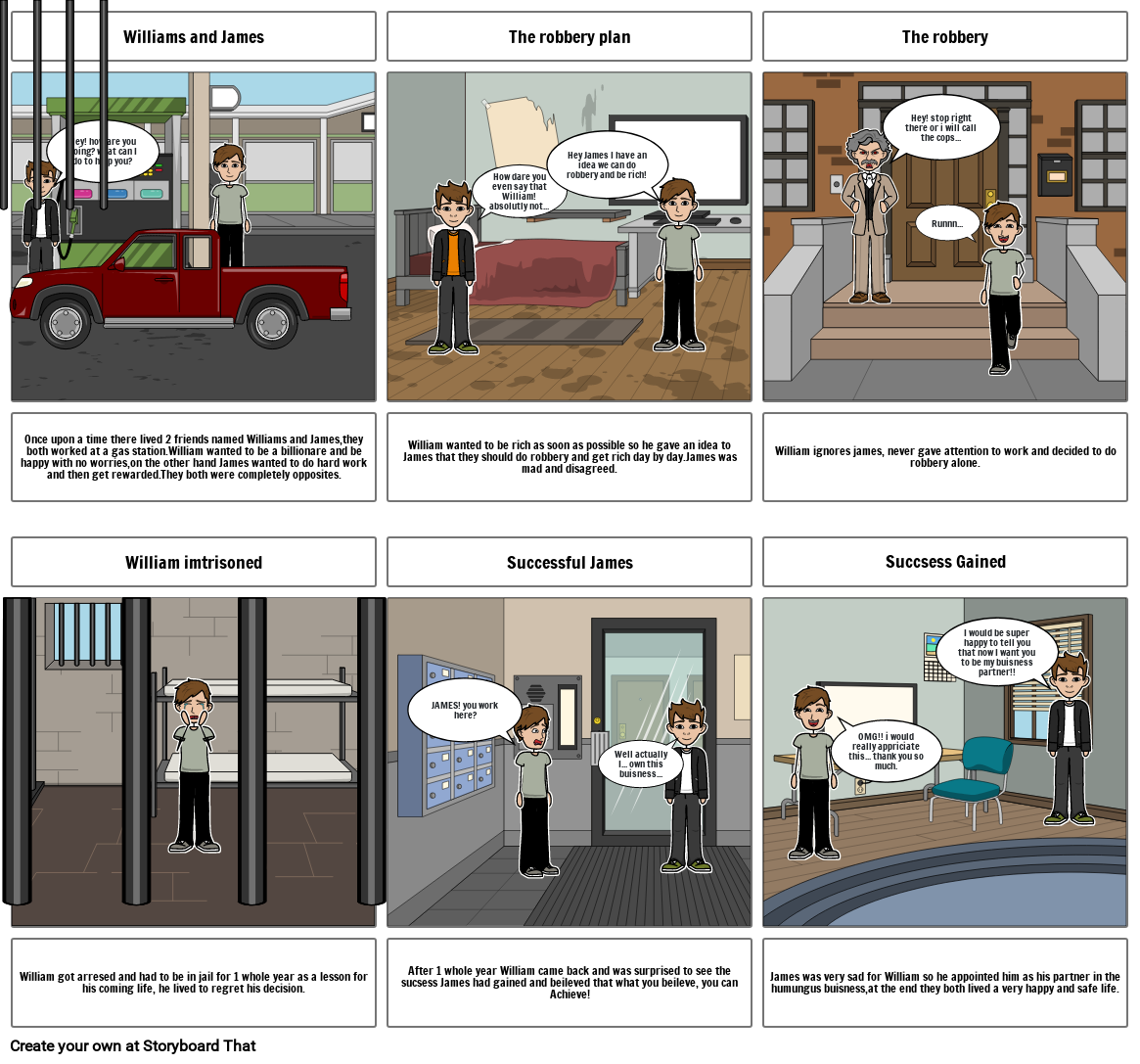 William wanted to be rich as soon as possible so he gave an idea to James that they should do robbery and get rich day by day.James was mad and disagreed.