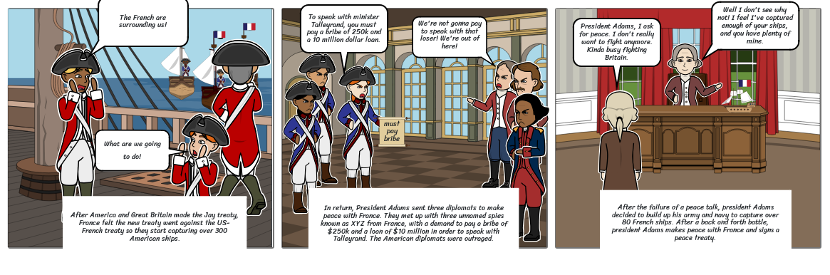 After the failure of a peace talk, president Adams decided to build up his army and navy to capture over 80 French ships. After a back and forth battle, president Adams makes peace with France and signs a peace treaty.