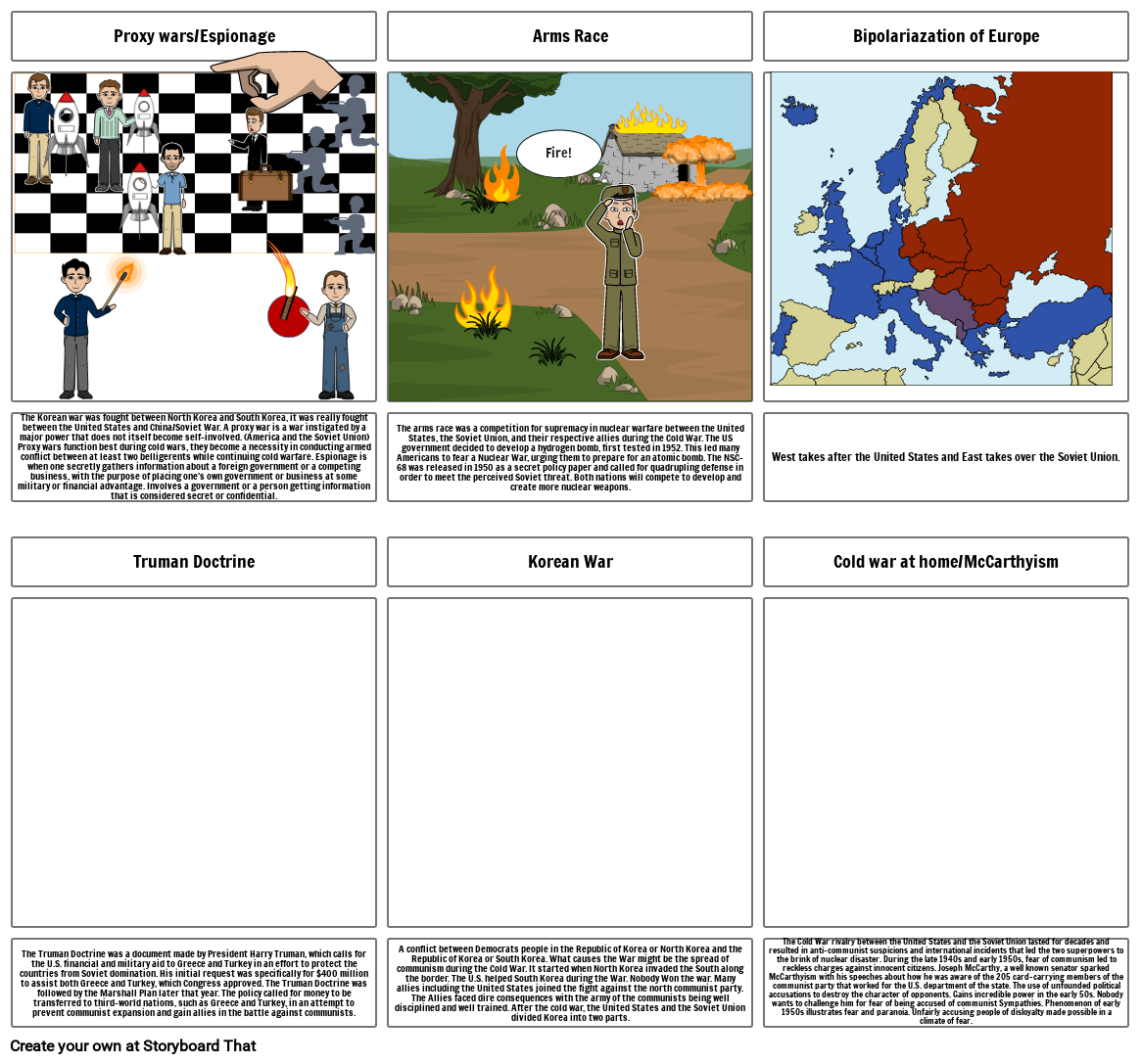 The Korean war was fought between North Korea and South Korea, it was really fought between the United States and China/Soviet War. A proxy war is a war instigated by a major power that does not itself become self-involved. (America and the Soviet Union) Proxy wars function best during cold wars, they become a necessity in conducting armed conflict between at least two belligerents while continuing cold warfare. Espionage is when one secretly gathers information about a foreign government or a competing business, with the purpose of placing one's own government or business at some military or financial advantage. Involves a government or a person getting information that is considered secret or confidential.