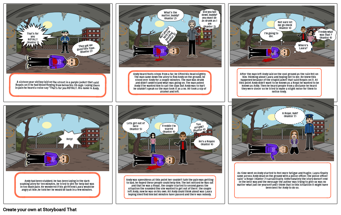 A sixteen year old boy laid on the street in a purple jacket that said Royals on it he had blood flowing from below his rib cage. Laying there in pain he heard a voice say "That's for you ROYAL!!. His name is Andy.