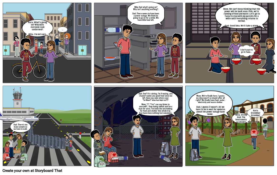 Mila: Dad what's going on? Why isn't anything working?.Dad: There seems to have been a power outage. We think its going to go on for a while. We have little food left.