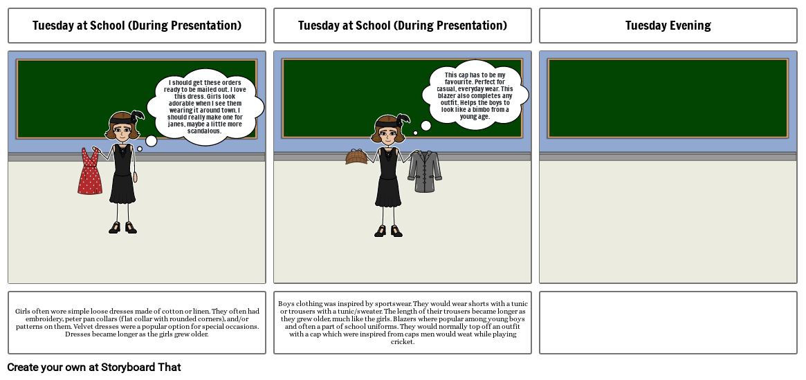 Boys clothing was inspired by sportswear. They would wear shorts with a tunic or trousers with a tunic/sweater. The length of their trousers became longer as they grew older, much like the girls. Blazers where popular among young boys and often a part of school uniforms. They would normally top off an outfit with a cap which were inspired from caps men would weat while playing cricket.