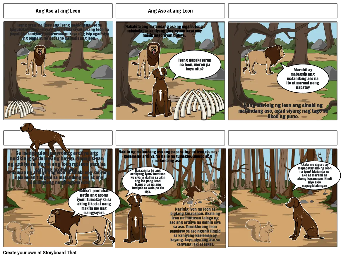 Nang marinig ng leon ang sinabi ng matandang aso, agad siyang nag tago sa likod ng puno.