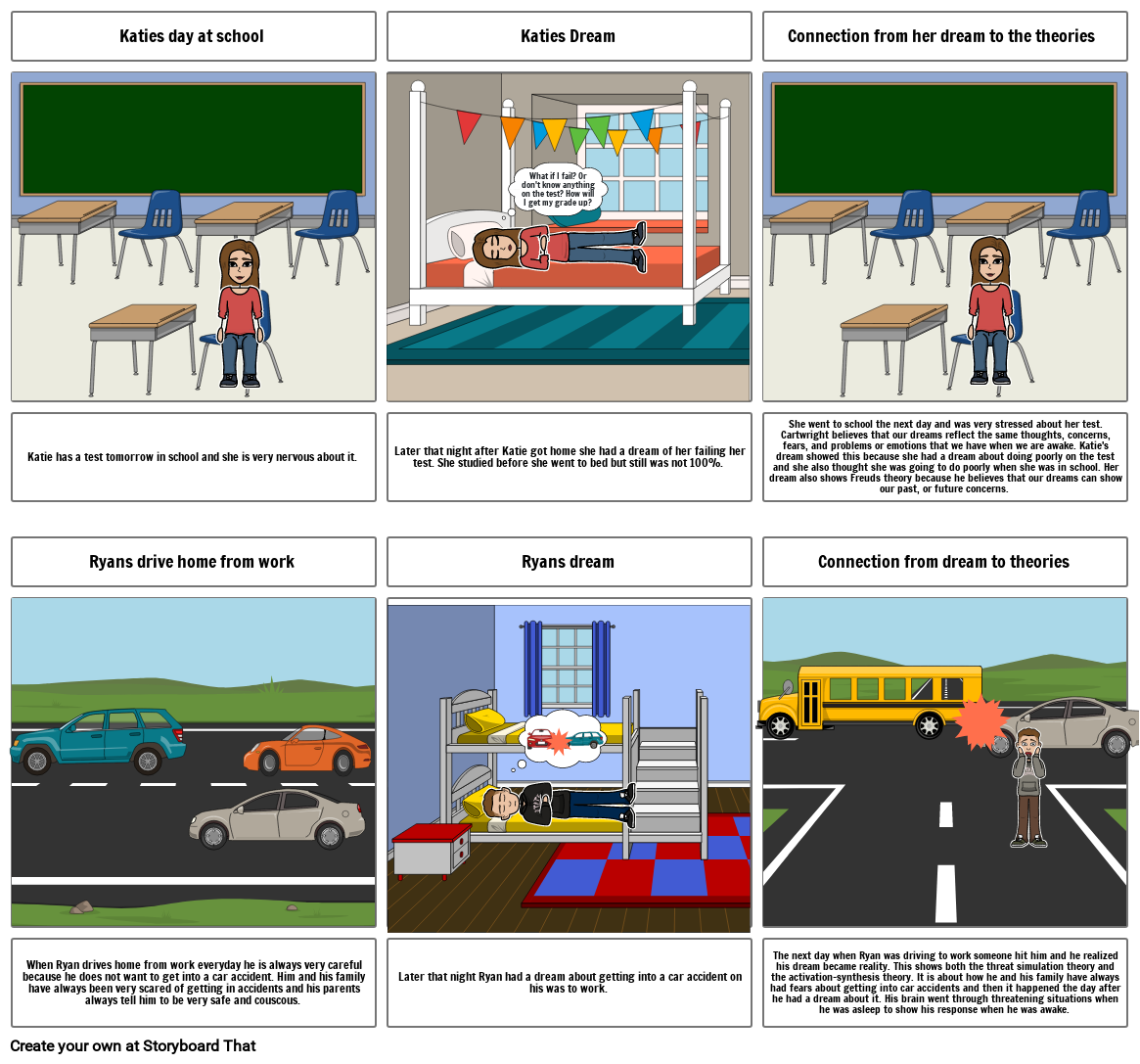 She went to school the next day and was very stressed about her test. Cartwright believes that our dreams reflect the same thoughts, concerns, fears, and problems or emotions that we have when we are awake. Katie's dream showed this because she had a dream about doing poorly on the test and she also thought she was going to do poorly when she was in school. Her dream also shows Freuds theory because he believes that our dreams can show our past, or future concerns.