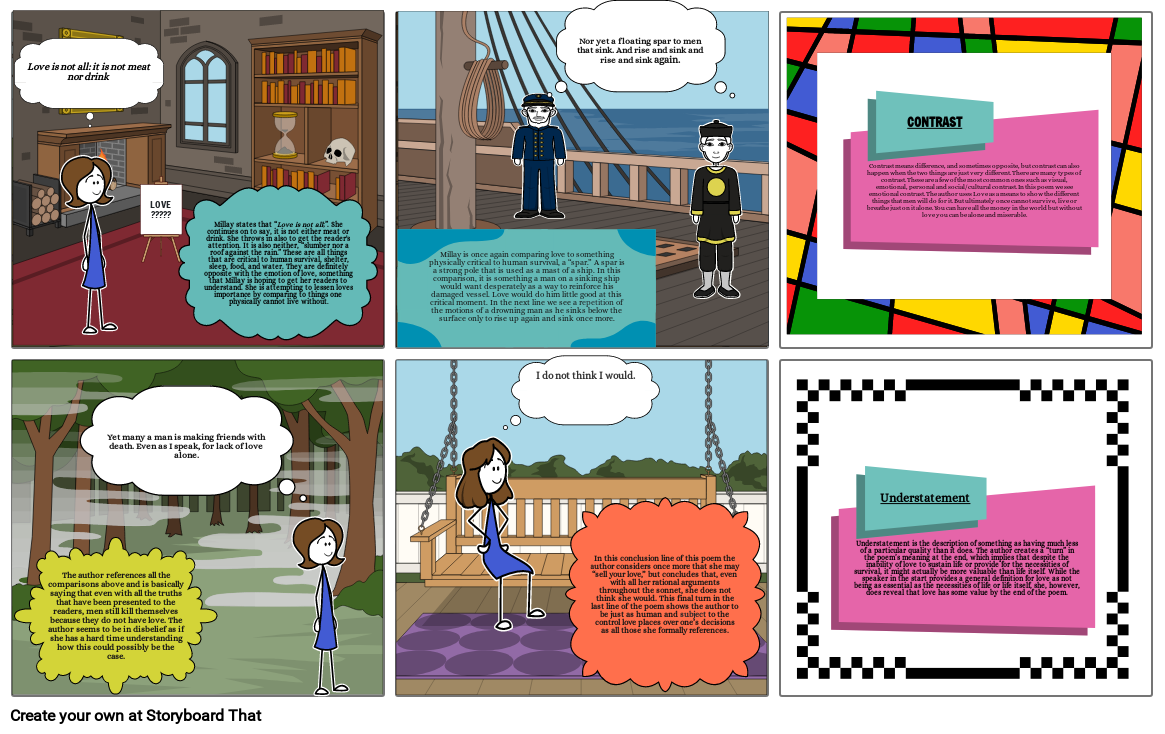 Understatement Understatement is the description of something as having much less of a particular quality than it does. The author creates a “turn” in the poem’s meaning at the end, which implies that despite the inability of love to sustain life or provide for the necessities of survival, it might actually be more valuable than life itself. While the speaker in the start provides a general definition for love as not being as essential as the necessities of life or life itself, she, however, does reveal that love has some value by the end of the poem.