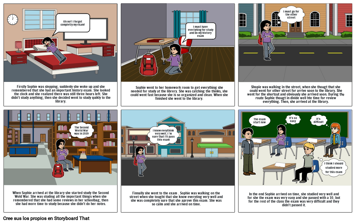 Firstly Sophie was slepping, suddenly she woke up and she remembered that she had an important history exam. She looked the clock and she realized there was still three hours left. She didn't study anything, then she decided went to study quikly to the library.