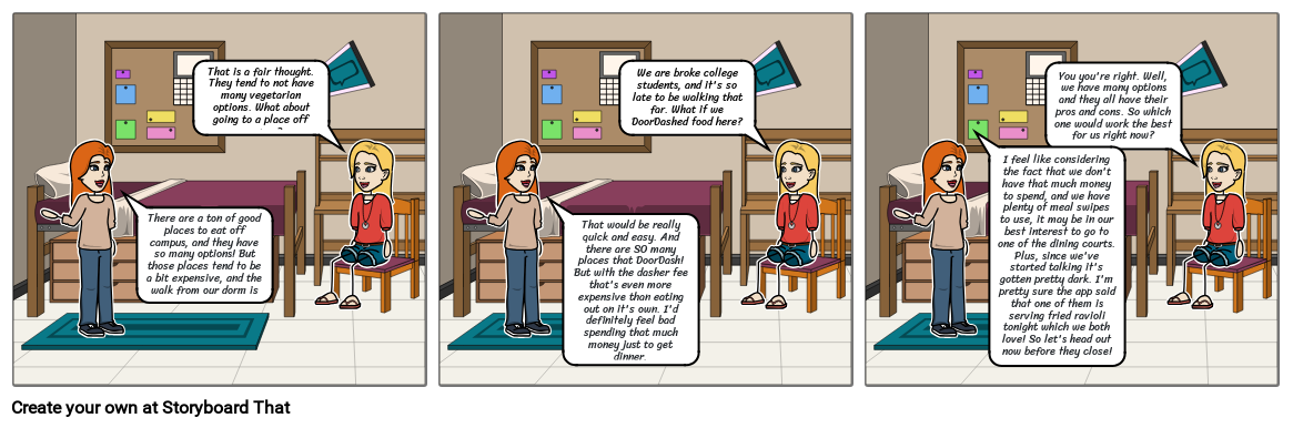 I feel like considering the fact that we don't have that much money to spend, and we have plenty of meal swipes to use, it may be in our best interest to go to one of the dining courts. Plus, since we've started talking it's gotten pretty dark. I'm pretty sure the app said that one of them is serving fried ravioli tonight which we both love! So let's head out now before they close!