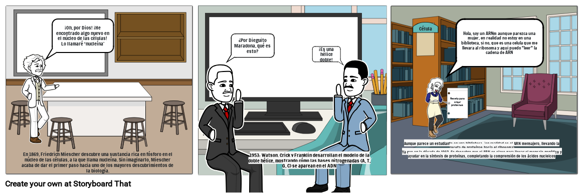 Aunque parece un estudiante en una biblioteca, ¡en realidad es el ARN mensajero, llevando la receta de proteínas hacia el ribosoma!Ya que en la década de 1960: Se descubre que el ARN es clave para llevar el mensaje genético y ayudar en la síntesis de proteínas, completando la comprensión de los ácidos nucleicos