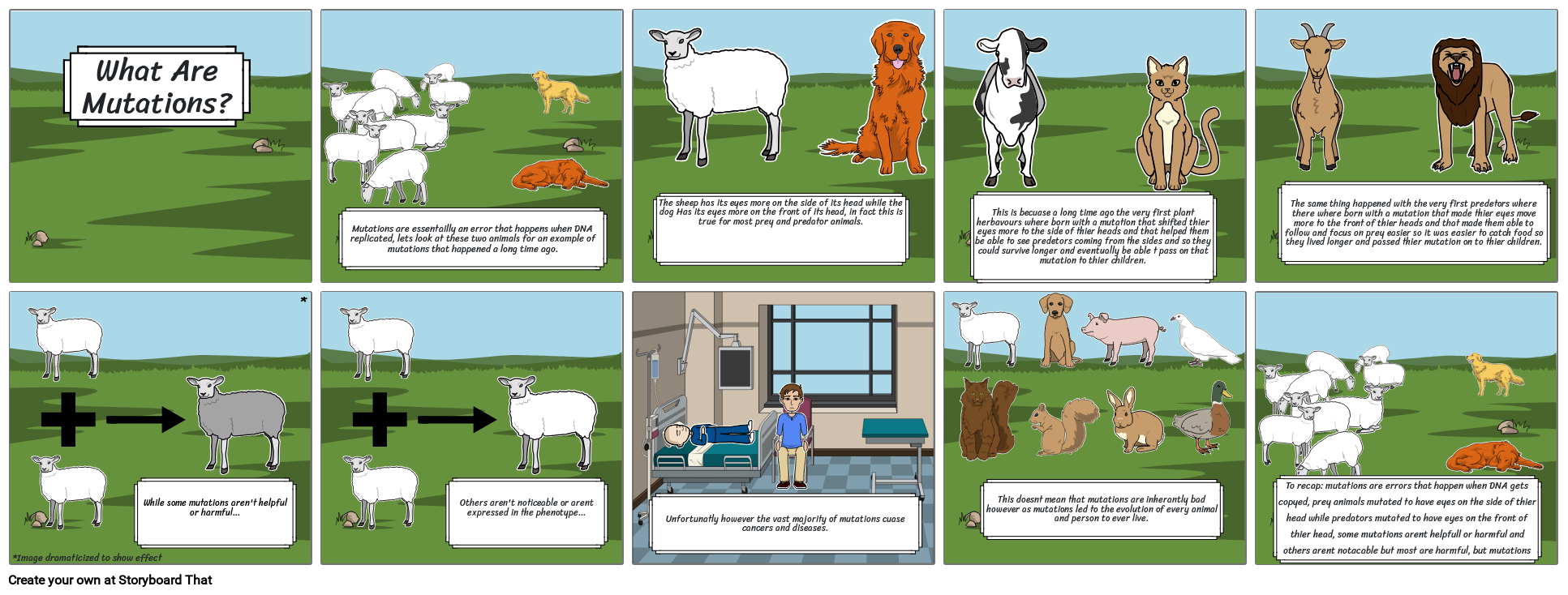 To recap: mutations are errors that happen when DNA gets copyed, prey animals mutated to have eyes on the side of thier head while predators mutated to have eyes on the front of thier head, some mutations arent helpfull or harmful and others arent notacable but most are harmful, but mutations led every animal and human alive.