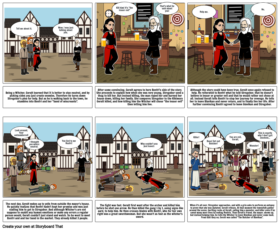 The next day, Geralt wakes up to yells from outside the mayor's house. He quickly realizes that Renfri hadn't kept her promise and was just stalling him to get to Stregobor. And although Witcher's are not suppose to exabit any human emotions or make any errors a regular person would, Geralt couldn't just stand and watch. So he went to meet Renfri and and her band in the market. They already killed 3 people.